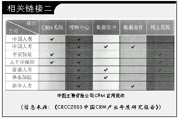 據(jù)某IT媒體2002年末的調(diào)研,只有不到1/5的中國保險公司擁有客戶關(guān)系管理系統(tǒng),但是近六成的保險公司計劃在近期內(nèi)實施CRM;另一份調(diào)查則顯示中國保險業(yè)過去3年的IT投入平均達到9.36億元,幾乎所有的保險公司都在從不同側(cè)面開展CRM建設(shè)。CRM在中國保險業(yè)的應(yīng)用,到底是處于落伍還是冒進狀態(tài),成為一個意味深長的話題。