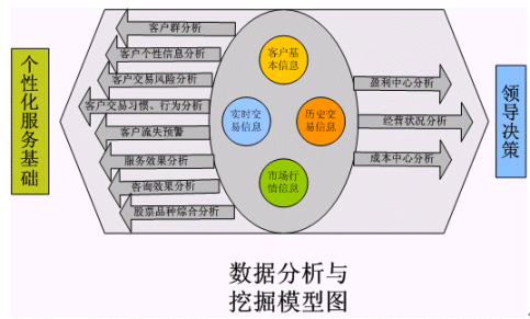 。。從上圖可以看出,在這個客戶信息數(shù)據(jù)分析模塊當(dāng)中,主要分析對象是客戶的基本信息、客戶的實時交易信息、客戶的歷史交易信息、客戶帳戶信息和市場行情信息等幾個處于孤島形狀的信息模塊。而得到的分析結(jié)果應(yīng)該包括如下幾個基本方面,以被為領(lǐng)導(dǎo)的決策和企業(yè)的業(yè)務(wù)流程服務(wù):