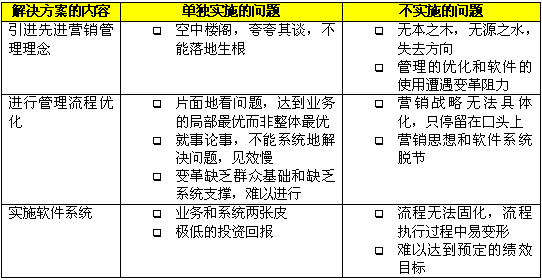 在CRM出現(xiàn)以前,企業(yè)為了解決市場、銷售和服務(wù)方面的問題,更好地吸引、獲得、保留和發(fā)展客戶,采取了各種方式,比如使用一套分銷管理的解決方案,或者請"點子公司"出謀劃策,或者尋求某個具體業(yè)務(wù)的優(yōu)化。以上這些做法往往只能完成局部的改進,或取得短期的效果,無法形成長期和整體的競爭優(yōu)勢。原因就在于這些解決方案都只提供了片面的、局部的解決方案,"頭痛醫(yī)頭,腳痛醫(yī)腳"不能綜合管理理念、業(yè)務(wù)流程和技術(shù)應(yīng)用這三個方面,系統(tǒng)地分析和解決問題。下表中分析了這些解決方案單獨實施或者不實施會帶來什么問題。