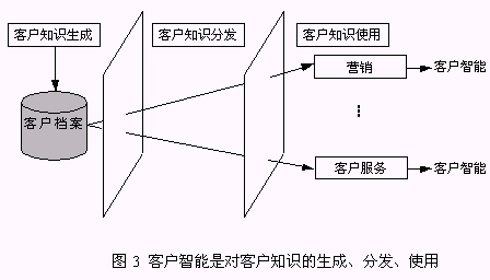 客戶知識(shí)是人們通過(guò)實(shí)踐認(rèn)識(shí)到的、與客戶有關(guān)的規(guī)律性,而客戶智能是獲得客戶知識(shí)并使用客戶知識(shí)求解問題的能力?蛻糁悄苁菍(duì)企業(yè)戰(zhàn)略決策真正有價(jià)值的事物和行動(dòng)?蛻糁悄懿粌H包括了客戶知識(shí)的生成,而且更強(qiáng)調(diào)了客戶知識(shí)在企業(yè)中的分發(fā)、使用,直到產(chǎn)生客戶智能。所以,客戶智能是對(duì)客戶知識(shí)的生成、分發(fā)和使用(圖3)。