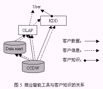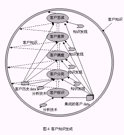 從以上構(gòu)成系統(tǒng)的三個(gè)組件的介紹中同時(shí)可以找到對(duì)以下兩個(gè)問題的答案:1、客戶數(shù)據(jù)、客戶信息、客戶知識(shí)之間的區(qū)別(圖5):由來(lái)自于事務(wù)系統(tǒng),如ERP、SFA等的源數(shù)據(jù)經(jīng)整理后放入CCDW或數(shù)據(jù)集市,這一過(guò)程處理的對(duì)象稱為客戶數(shù)據(jù);OLAP為決策人員提供了展示有意義的客戶數(shù)據(jù)的機(jī)制,這種有意義的客戶數(shù)據(jù)稱之為客戶信息;客戶數(shù)據(jù)和客戶信息均可以通過(guò)KDD技術(shù)的運(yùn)用,提升為對(duì)決策有價(jià)值的客戶知識(shí)。2、客戶知識(shí)生成的途徑:從對(duì)第一個(gè)問題的解答中可以知道,客戶知識(shí)從KDD作用的對(duì)象來(lái)看有兩種途徑:KDD作用于客戶數(shù)據(jù)、KDD作用于客戶信息,總之,客戶知識(shí)生成是依賴于KDD過(guò)程的復(fù)雜的過(guò)程。