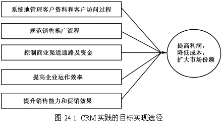 維奧制藥針對自身特定的業(yè)務需求,結合CRM的經營理念,提出圖24.1所示CRM實踐的目標實現(xiàn)途經。