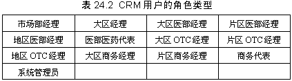 另外,對CRM系統(tǒng)的用戶也進行了明確的定義,按照工作性質,以及本著能夠快速高效地共享信息,提高銷售能力和工作效率的原則,確定表24.2所示的CRM用戶的角色類型。