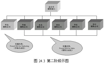 這一階段首先確立一個點(華北銷售公司),這個點的選擇要考慮多方面的因素,比如員工素質、電腦應用水平以及基礎設施等。第一階段目標的實現(xiàn)對整個項目關系重大,是一個示范性的實施,對維持管理層和員工對CRM項目的信心具有重要的意義。