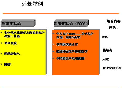在評(píng)估當(dāng)前情況與遠(yuǎn)景,資源需求,癥結(jié),極限以及鋪就路標(biāo)和里程碑的關(guān)系時(shí),實(shí)施展望和差距分析會(huì)議是十分重要的。取決于你對(duì)CRM遠(yuǎn)景的定義——無(wú)論是它將成為一個(gè)能夠給你一把競(jìng)爭(zhēng)利刃的企業(yè)策略 (類似的例子有Citicorp,Dell,F(xiàn)ord Motors) 或僅僅只是一個(gè)讓你更出眾的營(yíng)銷項(xiàng)目——這邁出的第一步在你選擇CRM方法論的過(guò)程中都必將起到舉足輕重的作用。一個(gè)核心的方法論必須能夠支持企業(yè)大部分的業(yè)務(wù)和流程需求,如MIS;客戶體驗(yàn)管理;接觸點(diǎn)管理;收益率管理等等。