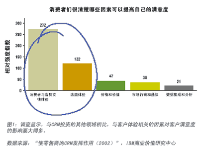 IBM商業(yè)價(jià)值研究中心的一項(xiàng)研究結(jié)果印證了筆者的設(shè)想。IBM 對(duì)美國(guó)10家零售商的消費(fèi)群進(jìn)行了調(diào)查,其中包括5家表現(xiàn)較好的(過去3年中在店面單位面積銷售和凈收入的增長(zhǎng)方面做得很好)和5家表現(xiàn)較差的(業(yè)績(jī)持平或出現(xiàn)下滑)。調(diào)查發(fā)現(xiàn),領(lǐng)先的零售商能夠同時(shí)有效使用關(guān)鍵的滿意度推動(dòng)因素和關(guān)系要素,為消費(fèi)者提供最佳的“總體體驗(yàn)”,即一家公司(或一個(gè)品牌)有形、無形地給客戶留下的總體印象。該項(xiàng)調(diào)查的統(tǒng)計(jì)分析結(jié)果發(fā)現(xiàn)了5組滿意度推動(dòng)因素: