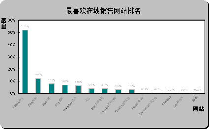 易趣中國(guó)和貝塔斯曼最不受歡迎。從最不喜歡在線銷售網(wǎng)站排名(如上圖)可以看出,易趣中國(guó)eBay