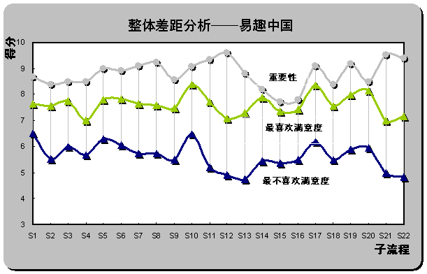 2) 重要流程欠缺最優(yōu)體驗(yàn)。雖然易趣中國(guó)被認(rèn)為是最不喜歡的在線銷售網(wǎng)站,但從滿意度評(píng)分也同時(shí)可以發(fā)現(xiàn),易趣中國(guó)在S1(瀏覽速度),S16(個(gè)人定制促銷信息的發(fā)布)和S15(個(gè)性化頁面設(shè)置)還是為用戶設(shè)計(jì)了相對(duì)較好的體驗(yàn)。但重要性得分排名前三位的子流程中,S12(產(chǎn)品質(zhì)量可靠)、S21(退換貨服務(wù))和S22(客戶投訴和反饋)仍為重要性與滿意度差距最大的三個(gè)子流程,易趣中國(guó)也未在重要流程上為用戶設(shè)計(jì)優(yōu)越的在線體驗(yàn)。