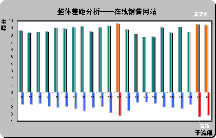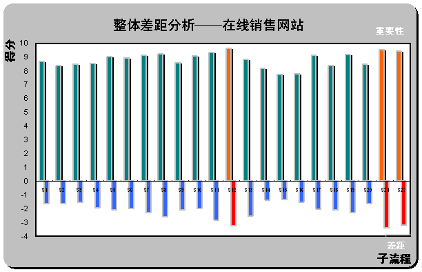 (2)整體差距分析(Gap Analysis)。請(qǐng)見上圖X軸下方所示,計(jì)算所有被調(diào)查對(duì)所列在線銷售網(wǎng)站的滿意度平均值(綜合最喜歡在線銷售網(wǎng)站和最不喜歡在線銷售網(wǎng)站的滿意度,計(jì)算被調(diào)查者對(duì)22個(gè)子流程的滿意度評(píng)分)。通過計(jì)算重要性和滿意度的差距,首先,一個(gè)有趣的現(xiàn)象,在著色的三個(gè)差距最大的子流程剛好也是重要性得分排名前三位的流程S12,