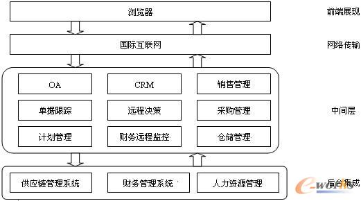 中間層:是實(shí)現(xiàn)具體的應(yīng)用功能的層次,包括銷(xiāo)售、采購(gòu)、倉(cāng)儲(chǔ)管理、遠(yuǎn)程審批/監(jiān)控/決策等;