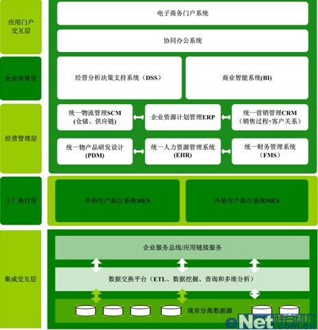 根據(jù)企業(yè)管理發(fā)展戰(zhàn)略及目標(biāo),需要考慮建設(shè)“集成化數(shù)字管控制造系統(tǒng)”,涵蓋企業(yè)決策層、企業(yè)經(jīng)營(yíng)管理層。根據(jù)整體業(yè)務(wù)模式,企業(yè)經(jīng)營(yíng)管理層又可以進(jìn)一步分解為公司管理層和工廠執(zhí)行層;從信息化戰(zhàn)略支撐角度可以分解為企業(yè)門戶交互層、應(yīng)用系統(tǒng)層、應(yīng)用集成層和網(wǎng)絡(luò)支撐層。實(shí)現(xiàn)企業(yè)信息流、資金流、物流、商物流的高度集成、統(tǒng)一,為企業(yè)生產(chǎn)、經(jīng)營(yíng)提供強(qiáng)有力的信息化支撐。