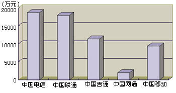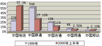 通過引入IP電話業(yè)務(wù),我國電信市場已經(jīng)形成了以中國電信、中國聯(lián)通、中國移動(dòng)、中國吉通和中國網(wǎng)通等五大電信運(yùn)營公司為主體的新格局。他們各自的業(yè)務(wù)范圍不盡相同,但I(xiàn)P電話是他們相同的業(yè)務(wù)之一,所以這一市場相互之間的競爭較為激烈。圖1和圖2分別表示這五大運(yùn)營商在2000年上半年IP電話的話務(wù)量和收入。從圖中可以看出,他們?cè)谖覈鳬P電話市場上所占據(jù)的地位和角色。
