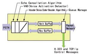 網(wǎng)關(Gate Way) 網(wǎng)關是在PSTN和分組交換網(wǎng)之間傳輸呼叫的器件,包括語音編碼器、回音抑制器、靜音抑制、收/發(fā)緩存器和分組交換網(wǎng)的排序管理等部分,如圖2所示。