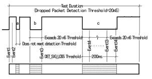 圖5所示的是丟包測試的時序圖, 圖中的語音路由測試信號即為“Golden Voice”產(chǎn)生的復合語音信號。在測試中,用戶可以自行設定分別為5ms、10ms、15ms、25ms、50ms或100ms檢測門限值。