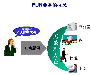 PUN業(yè)務(wù)首先給注冊(cè)用戶分配一個(gè)號(hào)碼,此號(hào)碼根據(jù)運(yùn)營(yíng)商所申請(qǐng)到的網(wǎng)號(hào)及用戶規(guī)模來(lái)規(guī)劃,如181XXXXXXX,申請(qǐng)到該號(hào)碼后,用戶可以通過(guò)各種方便的方式(如上網(wǎng)、打電話)等將此號(hào)碼綁定到任一特定終端,如家庭電話,移動(dòng)手機(jī)等,綁定以后,任何人在任何地點(diǎn)都可以通過(guò)拔打此號(hào)碼,PUN系統(tǒng)將會(huì)根據(jù)用戶的設(shè)置,將此呼叫經(jīng)IP網(wǎng)絡(luò)送至對(duì)應(yīng)的終端,從而完成呼叫,PUN用戶還可以設(shè)置繁雜的規(guī)劃,如當(dāng)手機(jī)關(guān)機(jī)時(shí),將呼叫送至某一固定電話,或在用戶上網(wǎng)時(shí),首選PC機(jī)作為呼叫終端,也可以根據(jù)時(shí)間段來(lái)靈活設(shè)置終端,其設(shè)置方法也比傳統(tǒng)的呼叫轉(zhuǎn)移更加方便和靈活。其圖一: