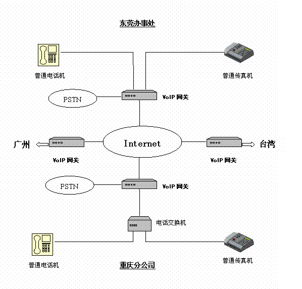 有一家臺(tái)商公司,在臺(tái)灣、東莞、廣州和重慶自己的分支機(jī)構(gòu),相互之間有大量的通話聯(lián)系,特別是研發(fā)部門,其通話量更是非常大。因此試圖在各個(gè)地方之間使用IP電話來(lái)降低通訊支出。在實(shí)施IP電話服務(wù)之前,各個(gè)地方都擁有完善的局域網(wǎng),并且申請(qǐng)了固定IP的寬帶接入。并且在辦公室內(nèi)部署了程控電話交換機(jī)。