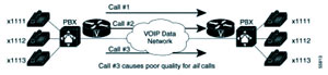 網(wǎng)絡(luò)中,話(huà)音網(wǎng)關(guān)路由器并不了解網(wǎng)絡(luò)中的狀況,包括:網(wǎng)絡(luò)的鏈路資源是否已經(jīng)飽和及網(wǎng)絡(luò)延遲,丟包率和網(wǎng)絡(luò)抖動(dòng)等參數(shù)是否可以滿(mǎn)足話(huà)音應(yīng)用的需求。如果在不能夠保證網(wǎng)絡(luò)可以提供足夠的資源保證話(huà)音質(zhì)量的情況下,建立新的通話(huà)鏈路可能影響已經(jīng)建立的鏈路,或者是降低所有的通話(huà)話(huà)音質(zhì)量。如圖三,如果廣域網(wǎng)的帶寬只能容納兩個(gè)語(yǔ)音的呼叫,第三個(gè)呼叫的建立會(huì)導(dǎo)致所有的呼叫質(zhì)量下降。在這種情況下,拒絕呼叫的建立好過(guò)建立一條沒(méi)有質(zhì)量保證的鏈路。