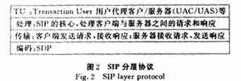 媒體封裝主要采用ITU-T的G系列和H系列建議,G系列用于語音壓縮,H系列用于視頻壓縮,提供視頻電話。SIP在協(xié)議棧中完成的功能是建立和終止多媒體通信:①用戶定位(user location):確定通信使用的終端系統(tǒng)位置;②用戶可用性判定(user availablity):確定被叫方是否愿意加入通信;③用戶能力判斷(user capability):確定通信使用的媒體類型及參數(shù);④會議建立(session setup):在主、被叫之間建立約定的支持特定媒體流傳輸?shù)倪B接;⑤會議管理(session management):包括傳輸、終止會議,修改會議參數(shù),調(diào)用業(yè)務(wù)。