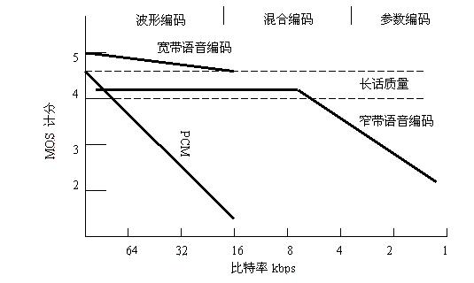 長(zhǎng)話質(zhì)量編碼器在比特率高于8Kbps時(shí)容易實(shí)現(xiàn),如圖4-2所示。長(zhǎng)話質(zhì)量的語(yǔ)音平均意見(jiàn)得分(MOS)必須在分或許分以上。傳統(tǒng)的PCN語(yǔ)音在比特率小于32