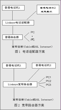 利用電話(huà)適配器和寬帶路由器實(shí)現(xiàn)VoIP服務(wù)提供以及與PC的連接,分別如圖1和圖2所示。