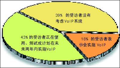 該調(diào)查收集了全球254名高級(jí)管理人員對(duì)未來企業(yè)網(wǎng)絡(luò)的意見和看法。其中,43%的受訪者表示,他們正在使用、測試或計(jì)劃在未來兩年內(nèi)實(shí)施VoIP;另外 18% 的受訪者表示,從長遠(yuǎn)的角度來講,他們會(huì)實(shí)施 VoIP。市場預(yù)測也顯示相同的樂觀前景。研究機(jī)構(gòu)Gartner Dataquest預(yù)期到2008年,公用電話交換網(wǎng) (PSTN) 的零售語音收入將輕微下跌,而VoIP的零售收入則上升 38.6%。