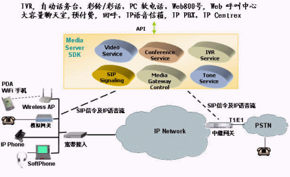 該公司的IP媒體服務器 (IP Media Server SDK)是一個具有IP多媒體處理能力和SIP呼叫功能的開放平臺。它主要提供給各增值業(yè)務開發(fā)商、軟交換廠商、軟件開發(fā)商以及具有開發(fā)能力的系統(tǒng)集成商;谠撈脚_,這些廠商可以迅速地、低成本地開發(fā)出各種各樣的基于IP的增值業(yè)務如下圖所示:
