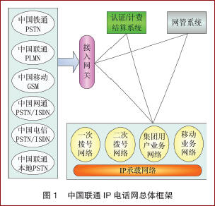 中國聯(lián)通IP電話網(wǎng)自1999年6月入運營以來,經(jīng)過一期、二期和三期工的建設(shè),目前,網(wǎng)絡(luò)已覆蓋中國329個地市,E1端口規(guī)模超過1.8萬個,成為全球最的IP電話網(wǎng)絡(luò)。網(wǎng)絡(luò)的話務(wù)量已經(jīng)達到月近10億分鐘,已是世界上流量最大的電話網(wǎng)絡(luò)。中國聯(lián)通IP電話網(wǎng)總體框架圖1所示,包括IP承載網(wǎng)絡(luò)、業(yè)務(wù)網(wǎng)絡(luò)(包式括一次撥號業(yè)務(wù)網(wǎng)、二次撥號業(yè)務(wù)網(wǎng)、集團用戶業(yè)務(wù)網(wǎng)和移動用戶業(yè)務(wù)網(wǎng))、IP電話網(wǎng)絡(luò)管理設(shè)備(如計費結(jié)算系統(tǒng)、網(wǎng)管系統(tǒng)等)、與各類本地網(wǎng)絡(luò)連接的接入網(wǎng)關(guān)等部分。
