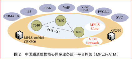 中國聯(lián)通IP電話網(wǎng)的承載網(wǎng)分為核心層和區(qū)域?qū)觾杉壗Y(jié)構(gòu),核心層由北京、上海、廣州、沈陽、武漢、西安和成都7個大區(qū)節(jié)點組成;區(qū)域?qū)影锤鞣止緟^(qū)域分布情況,劃分為22個區(qū)域。建網(wǎng)初期,承載網(wǎng)采用ATM+IP/VPN組成IP電話專用傳輸網(wǎng),確保IP承載層的QoS,網(wǎng)絡(luò)性能符合聯(lián)通測試指標(biāo)。下一階段,中國聯(lián)通數(shù)據(jù)核心網(wǎng)的技術(shù)演進路線方向如圖2所示。網(wǎng)絡(luò)將以MPLS+ATM為核心技術(shù),在7大核心節(jié)點建設(shè)功能強大的MPLS核心網(wǎng)絡(luò),同時采用2層MPLS技術(shù),實現(xiàn)與ATM設(shè)備的透明連接,從而構(gòu)建一個多協(xié)議、多業(yè)務(wù)同時兼顧IPv4/IPv6發(fā)展的先進網(wǎng)絡(luò)。中國聯(lián)通的互聯(lián)網(wǎng)、數(shù)據(jù)專線、IP電話、視頻會議、IPv6網(wǎng)絡(luò)、CDMA1X數(shù)據(jù)通信網(wǎng)等都承載在統(tǒng)一的數(shù)據(jù)傳送平臺之上。