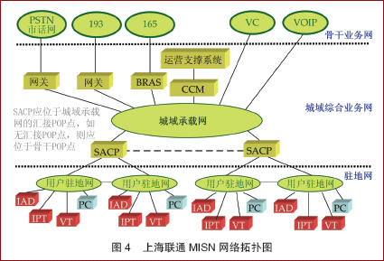 上海聯(lián)通MISN由5個部分組成(見圖4):(1)業(yè)務(wù)接入控制設(shè)備(SACP)。從用戶駐地網(wǎng)到城域網(wǎng)和骨務(wù)都必須通過SACP接的接入認證、業(yè)務(wù)接入控制、網(wǎng)絡(luò)資源管理和服務(wù)質(zhì)量控制等。(2)呼叫管理控制模塊(CCM)。該模塊負責(zé)對用戶注冊的管理;通過SACP對業(yè)務(wù)接入進行認證和控制;與骨干業(yè)務(wù)網(wǎng)GK互通,完成各種業(yè)務(wù)的呼叫控制;與SACP一起采集計費信息;負責(zé)控制語音和視頻媒體流的接入。(3)業(yè)務(wù)網(wǎng)關(guān)。聯(lián)通MISN是基于IP的分組網(wǎng),與基于電路交換的193長途電話骨干網(wǎng)和本地PSTN市話網(wǎng)互通時,由于媒體層面和控制信令層面都不同,因此,需要通過網(wǎng)關(guān)進行互通。(4)BRAS設(shè)備。負責(zé)將互聯(lián)網(wǎng)接入到165網(wǎng)。(5)業(yè)務(wù)運營支撐系統(tǒng)。該系統(tǒng)包括維護網(wǎng)管系統(tǒng)、用戶終端管理系統(tǒng)、用戶管理(業(yè)務(wù)受理、用戶信息管理、用戶業(yè)務(wù)授權(quán)與認證)以及本地MISN的計費/營賬系統(tǒng),其對上的接口是各骨干業(yè)務(wù)網(wǎng)的運維支撐系統(tǒng)。