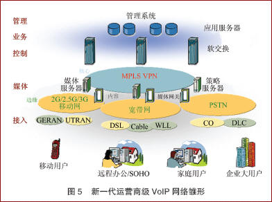 隨著以軟交換和MPLS/VPN兩項技術(shù)為核心的下一代網(wǎng)絡(luò)技術(shù)的不斷成熟和發(fā)展,將構(gòu)筑起新一代運營商級的VoIP網(wǎng)絡(luò)雛形,如圖5所示。