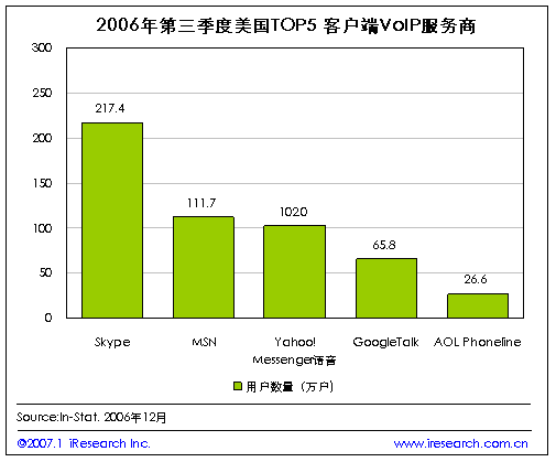 iResearch艾瑞市場咨詢根據(jù)In-Stat的統(tǒng)計(jì)數(shù)字整理發(fā)現(xiàn),目前在美國VoIP市場中,以客戶端為服務(wù)基礎(chǔ)的服務(wù)提供商的用戶數(shù)量來看,占市場主導(dǎo)位置的五大服務(wù)商為Skype、MSN、Yahoo、Google和AOL.到2006年第三季度為止,Skype的用戶已經(jīng)達(dá)到了217.4萬,排名第五位AOL Phoneline的用戶數(shù)量也有26.6萬之多。