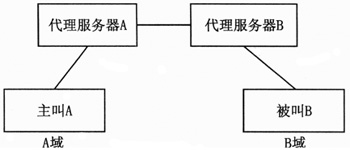 圖3給出了上述SIP消息選路過程。主叫A接入A域的代理服務(wù)器A后,代理服務(wù)器A查詢DNS,得到B域的代理服務(wù)器B的地址。最后由代理服務(wù)器B將invite消息發(fā)送至被叫B。在軟交換網(wǎng)絡(luò)中,代理服務(wù)器A和代理服務(wù)器B的功能都由軟交換機實現(xiàn)。