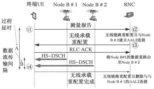 圖2中,傳輸時間間隔用時刻B表示,該時間可以忽略,因為UE從源小區(qū)到目標小區(qū)的切換是與網(wǎng)絡(luò)同步的。因此,對于像VoIP這樣的低延時實時業(yè)務(wù)來說,HSPA可以提供無縫的移動性。