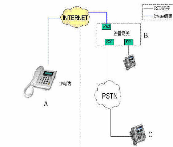 反之如果B點(diǎn)的當(dāng)?shù)仉娫捰脩鬋,透過(guò)電話撥接到B點(diǎn)的FXO口,然后利用INTERNET網(wǎng)絡(luò)轉(zhuǎn)接回A點(diǎn),這就是上車。