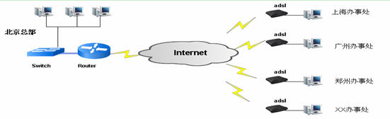 數(shù)據(jù)網(wǎng)絡(luò):各地辦事處通過(guò)ADSL接入Internet,構(gòu)建在Internet上與總部互通的寬帶網(wǎng)絡(luò)。