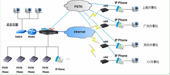 在企業(yè)總部部署一臺(tái)OfficeTen,利用OfficeTen的軟交換功能實(shí)現(xiàn)企業(yè)內(nèi)部IP網(wǎng)絡(luò)放號(hào)、IP Phone的注冊(cè)管理和寬帶網(wǎng)絡(luò)的接入,并可實(shí)現(xiàn)總部分機(jī)同時(shí)具有外線(xiàn)號(hào)碼功能。OfficeTen通過(guò)多路FXO口接入PSTN網(wǎng)絡(luò),通過(guò)Ethernet口接入Internet,實(shí)現(xiàn)語(yǔ)音和數(shù)據(jù)的綜合接入;對(duì)內(nèi)通過(guò)Ethernet口連接內(nèi)部Router和Switch,通過(guò)FXS口接入模擬PSTN