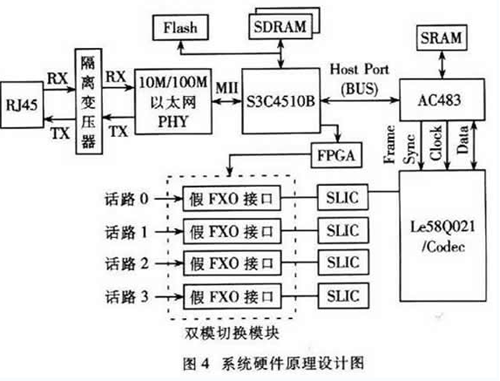 本節(jié)提出了一種基于H.323的雙模網(wǎng)關(guān)的系統(tǒng)設(shè)計(jì)方案,該方案支持4路話音,使用一種經(jīng)濟(jì)實(shí)用的“假FXO接口”方式實(shí)現(xiàn)雙模切換,能夠在VoIP通話時(shí)檢測(cè)到PSTN線上進(jìn)來的呼叫并可通過按話機(jī)的拍簧或者Flash閃斷鍵切換接聽!