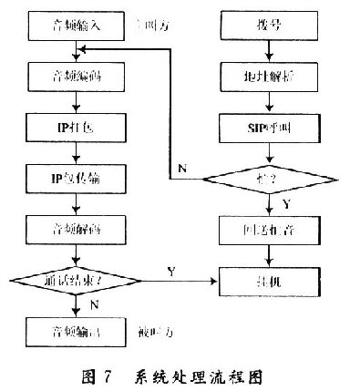 當(dāng)撥號確認(rèn)后,主控制器對編解碼器發(fā)送控制指令,開始語音A/D轉(zhuǎn)換,并進行編碼,送到片外存儲器內(nèi)進行緩存;Nios CPU對撥號信息的解析確定。目的地址,通過Avalon總線對以太網(wǎng)接口發(fā)送數(shù)據(jù)傳輸指令;將符合以太網(wǎng)標(biāo)準(zhǔn)的數(shù)據(jù)從片外存儲器內(nèi)讀出,送入Internet中,返回確認(rèn)信息。系統(tǒng)處理流程圖如圖7所示。