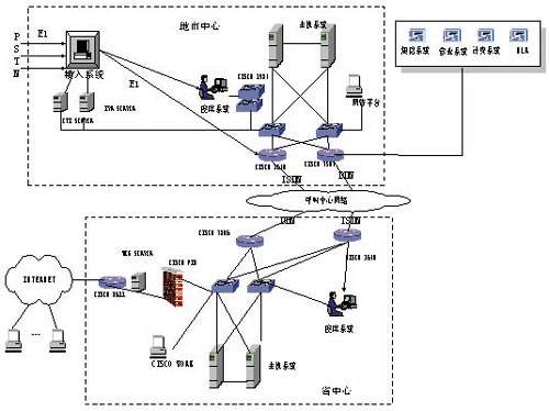 2611實現(xiàn)與INTERNET的互聯(lián)。通過CISCO WORK2000,實現(xiàn)對整個呼叫中心系統(tǒng)的網(wǎng)絡(luò)管理。