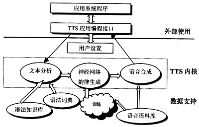 系統(tǒng)的構(gòu)成分為用戶編程接口和TTS內(nèi)核兩大部分。其中,內(nèi)核部分又可按照系統(tǒng)運(yùn)作的不同過程分為多個(gè)子模塊,包含了訓(xùn)練模塊、文本分析模塊、神經(jīng)網(wǎng)絡(luò)韻律生成模塊、語音合成模塊以及與語料庫(kù)之間的通信協(xié)議等。同時(shí),系統(tǒng)還考慮了不同類型用戶對(duì)TTS系統(tǒng)功能的需要,提供了豐富的編程接口。