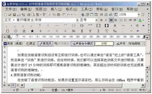 在安裝了語音識別功能后,如果你設置顯示語言欄,那么你將會在Office程序中看到如圖14所示的麥克風圖標(如果未看到,請從"工具"菜單中選中"語音"項),工作時將在"聽寫"和"聲音命令"模式之間進行切換。