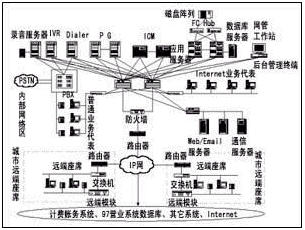 該方案采用Cisco的ICM中間件軟件作為系統(tǒng)的CTI服務(wù)器軟件平臺(tái),并采用相關(guān)廠商的IVR和Dialer產(chǎn)品作為IVR服務(wù)器和外撥服務(wù)器軟件。地市客服中心采用了交換機(jī)的遠(yuǎn)端模塊設(shè)置遠(yuǎn)端座席。Cisco的ICM中間件不但具有大話(huà)務(wù)量處理的高性能,而且支持多點(diǎn)呼叫中心的設(shè)置和基于純IP技術(shù)的呼叫中心的擴(kuò)充,從而保證了系統(tǒng)的可擴(kuò)展性。系統(tǒng)結(jié)構(gòu)如圖1所示。