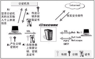 簡單來說,PKI就是由發(fā)布機(jī)構(gòu)發(fā)布證書給PKI的用戶,證書中含有用戶公共密鑰和個(gè)人密鑰的信息,由證書、證書授權(quán)機(jī)構(gòu)CA和實(shí)體三部分組成。PKI的用戶利用個(gè)人密鑰簽發(fā)信息或解密收到的信息,而其他用戶則使用對應(yīng)公共密鑰收發(fā)信息;赑KI的設(shè)計(jì),采用統(tǒng)一的證書分配、管理策略以及共同的可靠性驗(yàn)證機(jī)制,一方面可以保證E-mail的安全性,另一方面還可以解決現(xiàn)有不同系統(tǒng)無法進(jìn)行通信的弊病。因此,現(xiàn)有推出的一些優(yōu)秀E-mail系統(tǒng)如3R Soft推出的@SECURE都是基于PKI進(jìn)行設(shè)計(jì)的。通過數(shù)據(jù)加密的辦法只能保證郵件的機(jī)密性,卻無法完全保證郵件的完整性和不可抵賴性,即不能保證郵件在傳輸過程中不被他人篡改,且不被人冒名頂替發(fā)送。數(shù)字簽名可以有效地阻止這一現(xiàn)象,即在發(fā)送E-mail的同時(shí),加上一個(gè)Hash冗余信息。發(fā)送者使用Hash函數(shù)創(chuàng)建信息的摘要,作為信息數(shù)字指紋,然后用個(gè)人密鑰加密信息摘要,加密后的信息摘要就是數(shù)字指紋。目前較為常用的,如在 @SECURE 中采用的MD5算法,它是一種單向散列算法,大小為128比特,經(jīng)計(jì)算,它被仿制的概率小于1/265,符合安全性的需要。