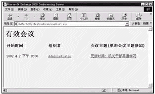 如果在前面已設(shè)置了提醒功能,那么在臨近會(huì)議前屏幕上將出現(xiàn)提醒窗口。教師機(jī)和學(xué)生機(jī)有三種方法可以參加會(huì)議:點(diǎn)擊提醒窗口中[參加會(huì)議]按鈕;或者不等提醒,直接點(diǎn)擊會(huì)議邀請(qǐng)函中的鏈接打開會(huì)議網(wǎng)頁(yè);最好的方式還是打開IE,輸入網(wǎng)址http://x/conferencing/list.asp進(jìn)入會(huì)議(x為Exchange服務(wù)器的IP地址或計(jì)算機(jī)名),如圖3。