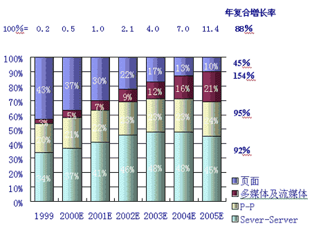 同時,人們對P-P的互動及多媒體的傳輸?shù)男枨髮⒊蔀榫W(wǎng)絡(luò)使用的2個最主要的發(fā)展趨勢。據(jù)麥肯錫公司和JP摩根的分析和預(yù)測,多媒體及流媒體的IP流量將以每年154%的復(fù)合率增長,而P-P的IP流量將以95%的年復(fù)合增長率增長,這2項(xiàng)將成為用戶需求增長最快的業(yè)務(wù)。如下圖,