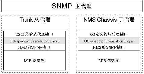 SNMP采用了Client/Server模型的特殊形式:代理/管理站模型。對網(wǎng)絡(luò)的管理與維護(hù)是通過管理工作站與SNMP代理間的交互工作完成的。每個(gè)SNMP從代理負(fù)責(zé)回答SNMP管理工作站(主代理)關(guān)于MIB定義信息的各種查詢。下圖10是NMS公司網(wǎng)絡(luò)產(chǎn)品中SNMP協(xié)議的實(shí)現(xiàn)模型。