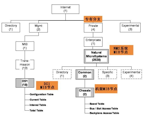 下圖給出了NMS系統(tǒng)中SNMP可訪問網(wǎng)絡(luò)設(shè)備的對象識(shí)別樹(OID:Object Identifier)結(jié)構(gòu)。