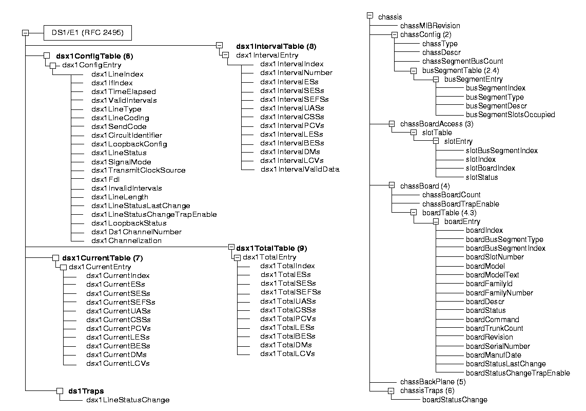 圖14中左圖給出了RFC2495對DS1/E1中繼線的MIB信息樹圖,右圖是NMS系統(tǒng)中對機(jī)架Chassis管理MIB約定。