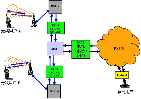 GSM實施了A-Interface(空中接口)體系結構。在圖1中,給出了部署A-Interface戰(zhàn)略的通用GSM網(wǎng)絡配置。如圖所示,這種拓撲方案在A-Interface上采用了VQE(EC-1和EC-2)功能,在PSTN接口處僅采用了EEC(EC-3)功能。這種方案給出了一種技術出眾的格局。EC-3組件消除了源自"PSTN到移動"呼叫所致的電氣(混合)回聲,而EC-1和EC-2部件則在每一次的"移動對移動"以及"移動到PSTN"呼叫上提供了VQE(語音質(zhì)量增強)功能。