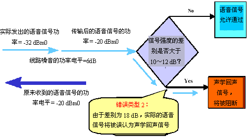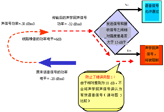然而,如果判斷過程是根據(jù)功率電平的相對差異來進行的(而不是絕對差異),測量結(jié)果將更為準確。通過在靜音期間測量兩個傳輸方向上的線路功率電平,就能得知相對的功率電平差異。使用在靜音期間獲得的信息,在分類信號前(即決定信號是聲學(xué)回聲還是有效語音),對呼叫兩端的功率電平差異進行修正,就能更加準確地了解相對信號強度。該方法稱為智能語音檢測,它能顯著降?quot;錯誤類型1"出現(xiàn)的可能性,如圖9所示。注意,在分析該方法時,請比對圖5和圖9。
